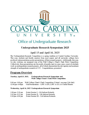 The 2025 CCU Undergraduate Research Symposium included 168 oral and poster presentations (51 oral presentations and 117 poster presentations) and an additional 20 team pitch presentations composed of 57 students who participated in the inaugural year of the Wall College’s Chant’s Tank Pitch Competition.